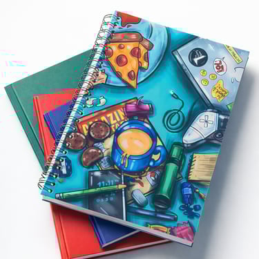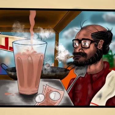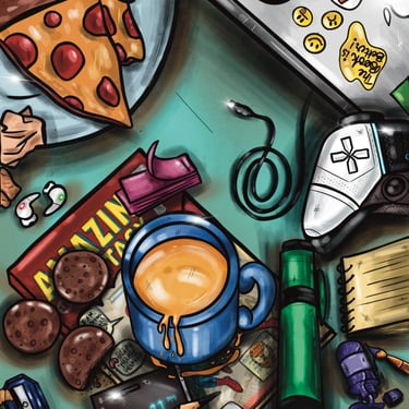The artwork captures small, familiar moments— chai/chaya, notes, laptop, controller, comic-book and scattered ideas—reflecting a timeless journal filled with thoughtfully curated prompts and writing exercises, designed to inspire you to return to it again and again.